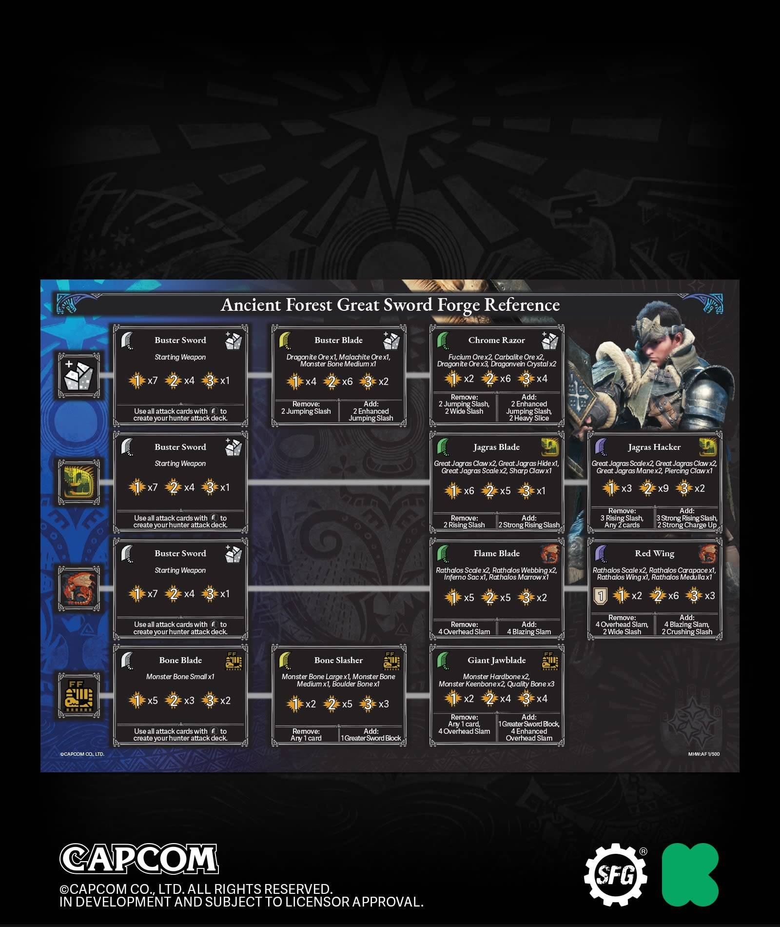 For your attack deck contents, check the list on the bottom of the weapon card. Remove the cards listed in the ‘remove’ column, and add the ones listed in the ‘add’ column.