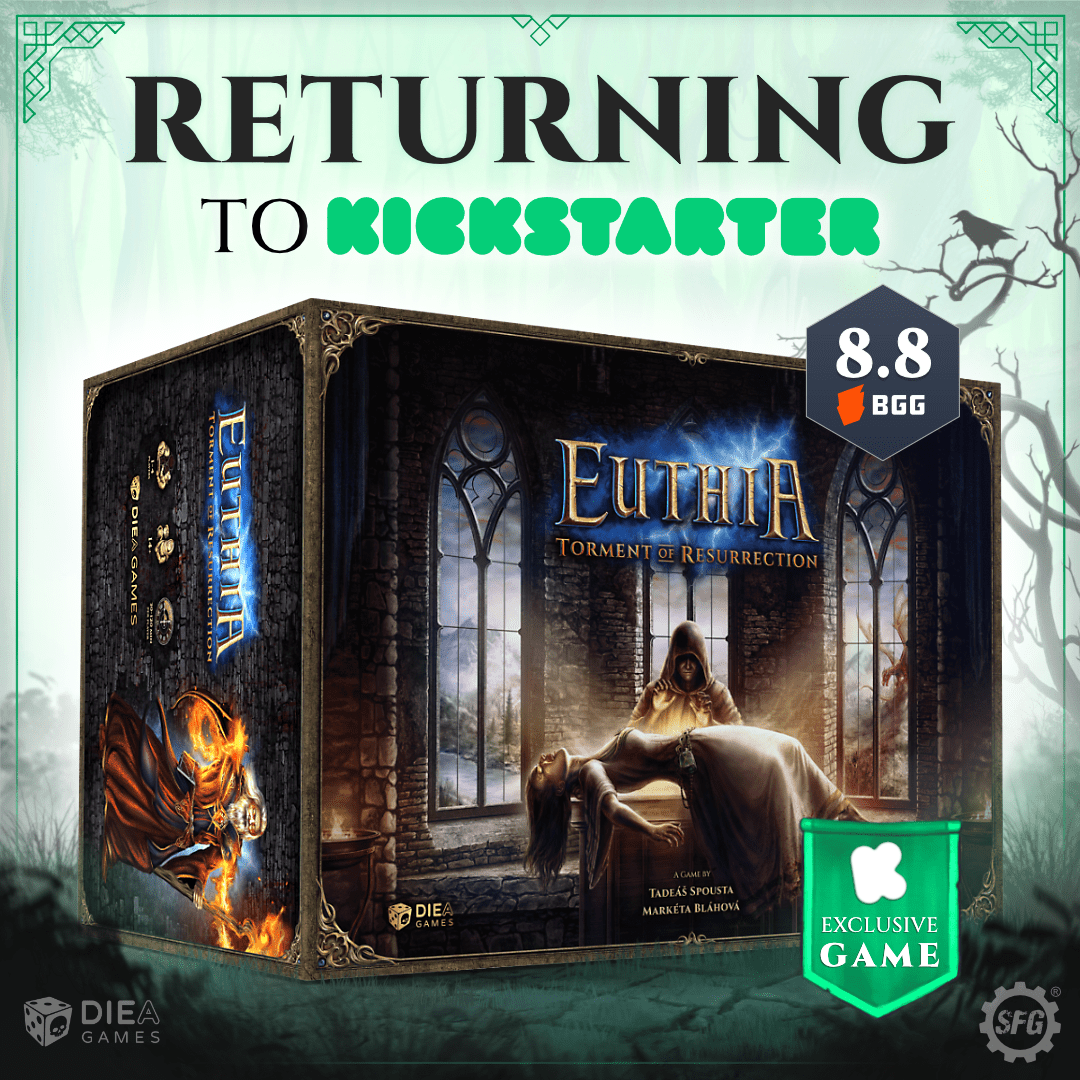 By acquiring the Euthia IP, Steamforged are able to use their significant experience in successfully crowdfunding, publishing, and delivering tabletop games to re-launch the game. This time, the crowdfunding campaign will run on Kickstarter, with streamlined new pledge levels designed to offer viable, high-quality products to new and returning backers, without sacrificing gameplay content.