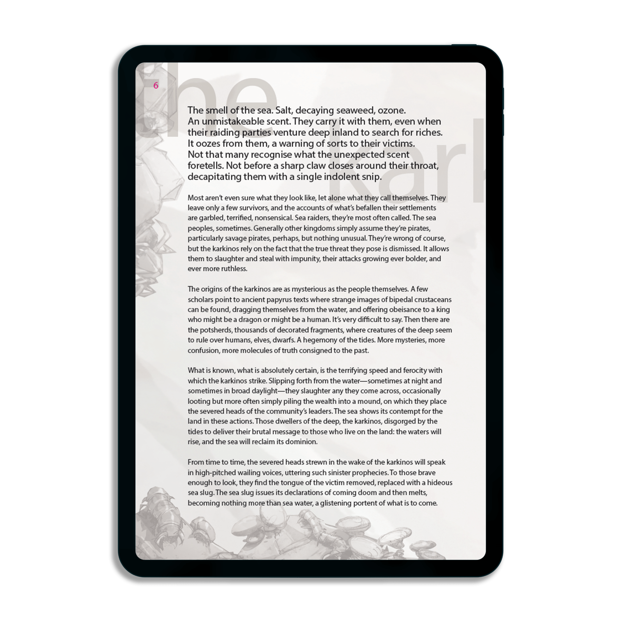 Crab folk. The Karkinos. Any sailor worth his salt has learned to fear these cut-throat crustaceans. Still, some dismiss them as simple pirates. The briny depths are littered with the corpses of those who learned the truth. The Karkinos strike with the speed of the tides, slipping forth from the water for brutal slaughter, leaving behind a mound of severed heads and a rumour. A rumour of death from the deeps.