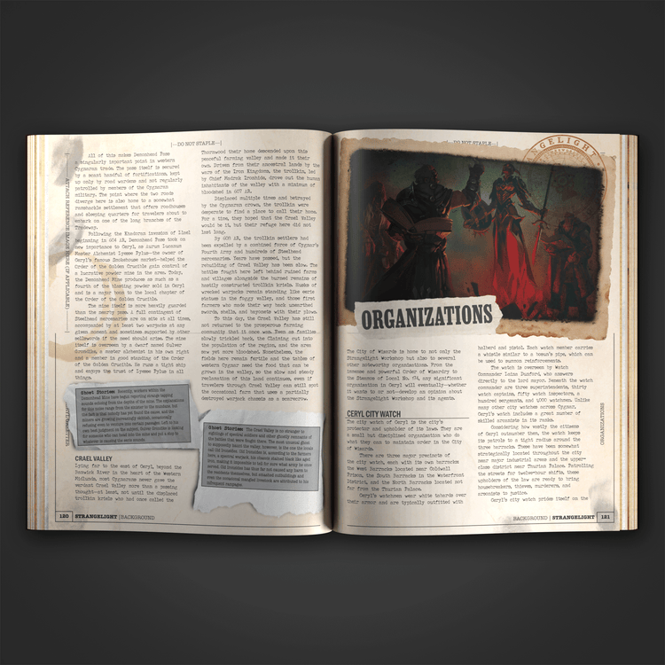 The STRANGELIGHT WORKSHOP Core Book will usher you into the Iron Kingdoms, where arcane science and steam power combine to create wonders that have transformed civilization. Yet, dangerous creatures lurk on the fringes of progress — specters, phantoms, infernals, and eldritch beings.