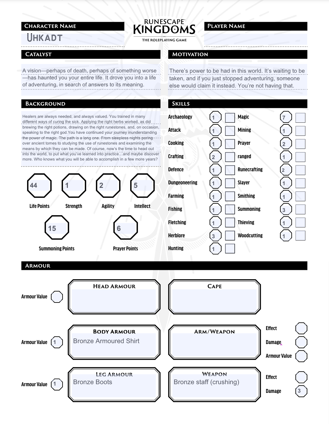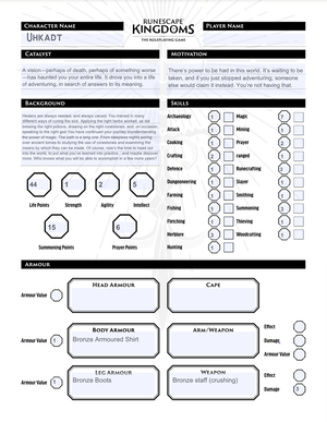 RuneScape Kingdoms: Roleplaying Game Character Sheet - Uhkadt - Apprentice Wizard Travelling Healer (PDF)